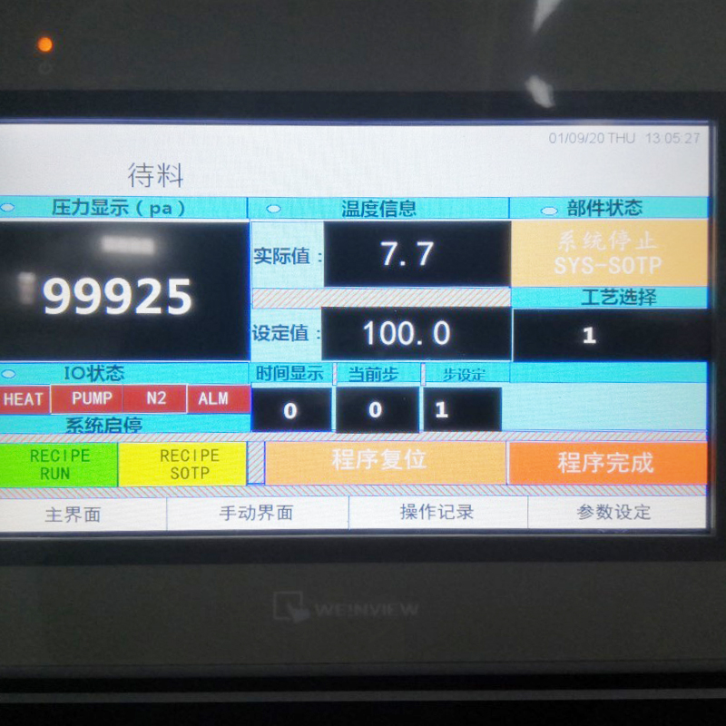 | সরঞ্জাম অপারেশন প্রক্রিয়া বিবরণ | সরঞ্জামগুলি পিএলসি শিল্প নিয়ন্ত্রণ প্রোগ্রামিং নিয়োগ করে। প্রোগ্রামেবল কন্ট্রোলে ভ্যাকুয়াম পাম্পের স্টার্ট/স্টপ স্ট্যাটাস, ভ্যাকুয়াম লেভেল সেটিং, ভ্যাকুয়াম হোল্ড ডিউরেশন, ইনর্ট গ্যাস ফিলিং টাইম, ইনর্ট গ্যাস সোলেনয়েড ভালভ ক্লোজার টাইম এবং হিটিং সাইকেল সূচনা/সমাপ্তি অন্তর্ভুক্ত থাকে। | ||